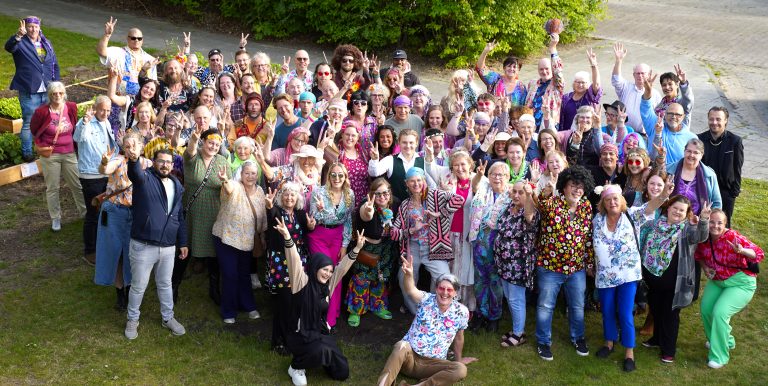Een groot deel van de vrijwilligers tijdens het vrijwilligersfeest met Flower Power thema.